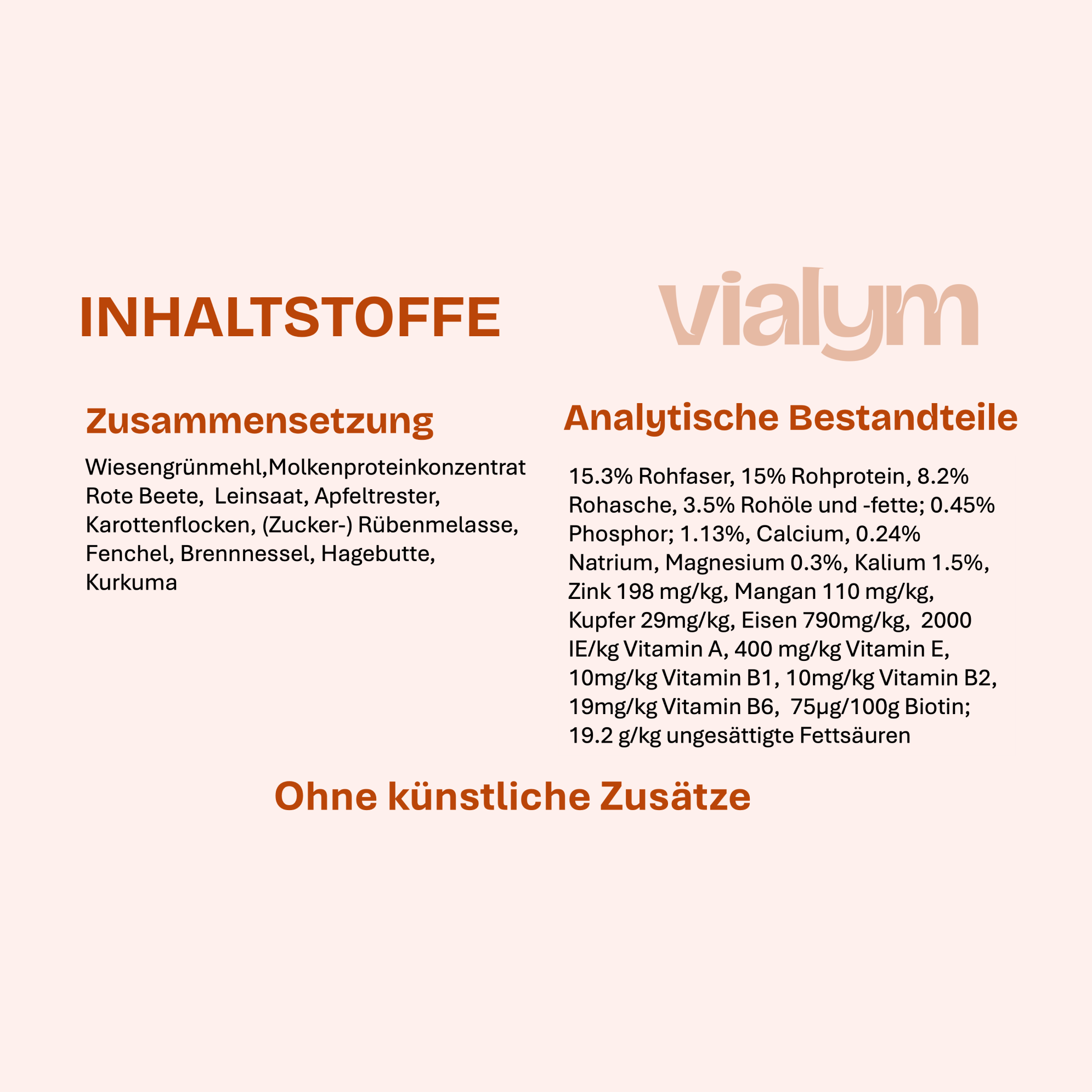 Weidegrünmehl, Molkeneiweiß, Rüben, Leinsamen, Apfeltrester, Karotten, (Zucker-)Rübenmelasse, Fenchel, Brennnesselkraut, Hagebutte, Kurkuma